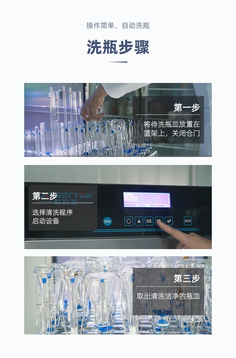 (2)它嚴(yán)格執(zhí)行設(shè)定好的清洗程序,更系統(tǒng)化、精細(xì)化、標(biāo)準(zhǔn)化。而人工清洗難免會因?yàn)榍逑慈藛T經(jīng)驗(yàn)、經(jīng)歷等問題,難以實(shí)現(xiàn)標(biāo)準(zhǔn)化清洗。并且一些瓶皿清洗要求上不能使用刷子等工具,無疑也增加了人工清洗難度。